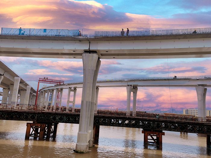 同時(shí),組織多名工人在登高車(chē)上,安裝匝道邊緣懸空支架,為立模和安全防護(hù)筑牢第一道防線。有3條匝道凌空飛架在甬舟高速金堂大橋上方,安全防護(hù)是橋面防護(hù)撞欄施工的重中之重,該項(xiàng)目部在匝道兩側(cè)分別安裝了40多米長(zhǎng)、1米寬的護(hù)欄,掛上細(xì)密的塑料網(wǎng),施工過(guò)程中的碎渣都掉在了網(wǎng)上,保障了海上日均車(chē)流量達(dá)6萬(wàn)左右的既有大橋安全暢通。