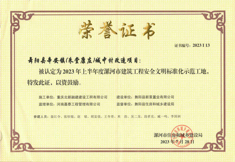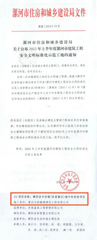 舞陽訊(通訊員:翟倚涵 盧仕磊)近日,河南省漯河市住房和城鄉(xiāng)建設(shè)局發(fā)布了2023年上半年度漯河市建筑工程安全文明標準化示范工地名單,重慶北新融建公司承建的舞陽縣辛安鎮(zhèn)(朱堂康莊)城中村改造項目部(以下簡稱:舞陽房建項目)榮獲“建筑工程安全文明標準化示范工地”稱號。