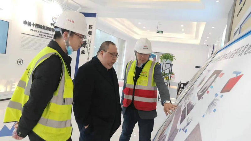 項目經(jīng)理阮超(右1)向總承包部指揮長李兵(右2)匯報施工總體情況