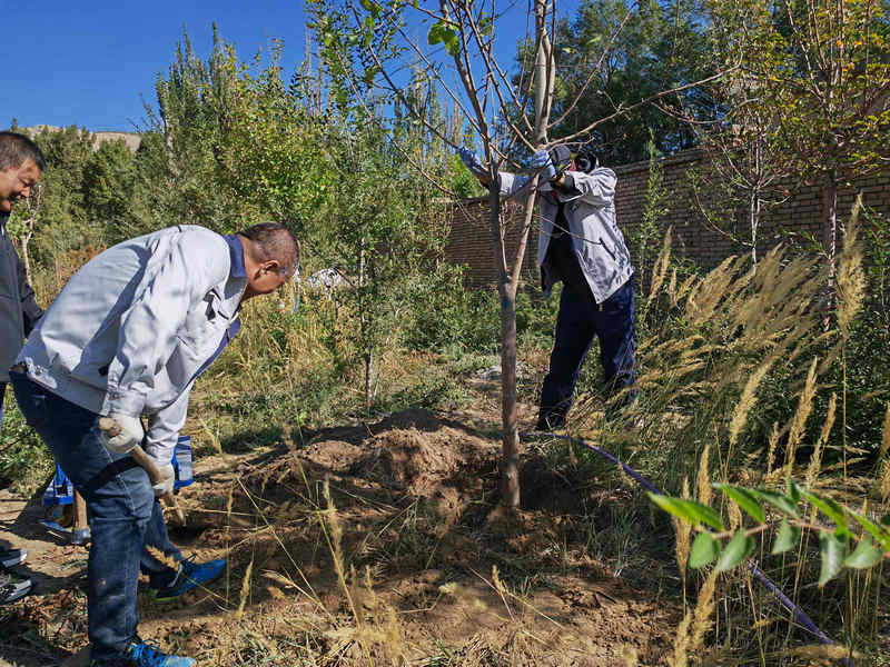 在植樹活動中,分公司全體黨員充分發(fā)揮優(yōu)良作風(fēng),迎著秋風(fēng)揮鍬大干,挖坑、培土、澆水,現(xiàn)場熱火朝天、忙碌有序。為確保樹木的成活率,采用滴灌技術(shù)進行澆水,用木棍組成三角支架進行固定捆綁,讓其不容易倒下。經(jīng)過大家的共同努力,幾十棵新栽的蘋果樹、榆樹在秋風(fēng)中搖曳,植樹綠化將有效改善工作生活環(huán)境。