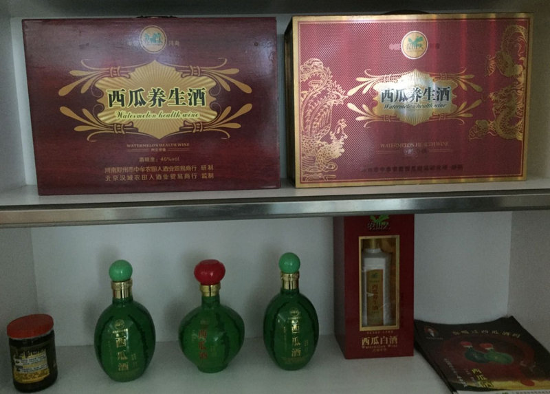 記者同田金相來到了他在“中牟縣西瓜協(xié)會”和“中牟縣農田西瓜蔬菜研究所”的辦公室,看到辦公桌上擺滿了標有不同配方的各種西瓜酒樣品。田金相告訴記者,西瓜酒是以西瓜汁為主料,輔以糯米、小麥、雪蓮、黨參、蜂蜜等釀造而成,酒精度數(shù)從10度到50度不等。