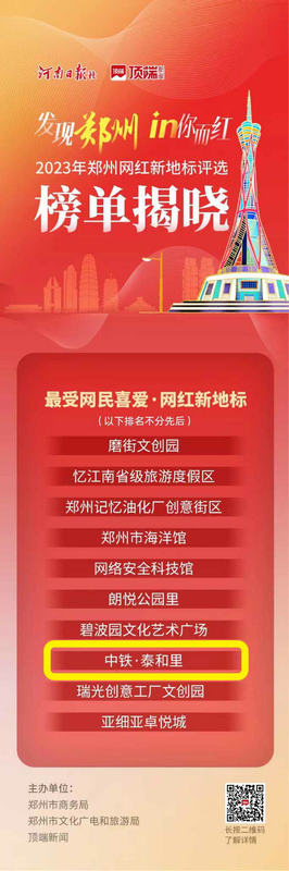 2024年1月,河南日報社·頂端新聞聯(lián)合鄭州市商務局、鄭州市文化廣電和旅游局等部門聯(lián)合發(fā)起了“發(fā)現(xiàn)鄭州·2023鄭州網(wǎng)紅新地標”網(wǎng)上征集評選活動,累計投票數(shù)達50萬+,掀起了全民參與投票的活動熱潮。中產(chǎn)置業(yè)公司中鐵·泰和里承辦了本次活動線下頒獎儀式,頒獎儀式發(fā)布了“最受網(wǎng)民喜愛·網(wǎng)紅新地標”“雙十佳人文景點·網(wǎng)紅新地標”“十佳自然景觀·網(wǎng)紅新地標”“十佳街區(qū)商業(yè)·網(wǎng)紅新地標”等50個“2023鄭州網(wǎng)紅新地標”,中鐵·泰和里榮獲“最受網(wǎng)民喜愛·網(wǎng)紅新地標”和“最佳組織獎”。