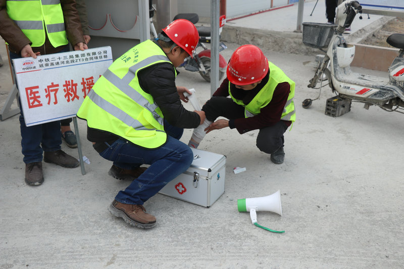 演練正式開始,模擬場(chǎng)景為當(dāng)一位現(xiàn)場(chǎng)安全員接到發(fā)生險(xiǎn)情的通知后,他迅速上報(bào)項(xiàng)目部,項(xiàng)目部安全總監(jiān)立刻按照《延崇項(xiàng)目部突發(fā)事件安全應(yīng)急預(yù)案》實(shí)施,組織事先準(zhǔn)備好的各分組人員趕赴災(zāi)情現(xiàn)場(chǎng)。事故發(fā)生后,首先是通訊聯(lián)絡(luò)組立即通知安全人員、檢修人員原地待命,并中斷一般外線電話,保持事故處理外線暢通;第二步,由治安疏散組迅速辨別、查明現(xiàn)場(chǎng)是否因火災(zāi)引起次生事故,確定警戒區(qū)域,設(shè)置警戒標(biāo)志,維持道路交通秩序。同時(shí),按照預(yù)案要求,引導(dǎo)人員沿既定的疏散路線進(jìn)行緊急撤離;第三步,應(yīng)急搶險(xiǎn)組負(fù)責(zé)事故現(xiàn)場(chǎng)檢測(cè)工作,為正在進(jìn)行搶險(xiǎn)的隊(duì)員進(jìn)行防護(hù)監(jiān)護(hù),同時(shí)儲(chǔ)備一定量的防護(hù)用具以及搶險(xiǎn)裝備;第四部,醫(yī)療救援小組按照預(yù)定演練方案,積極配合搶險(xiǎn)小組,將送來(lái)的患者,根據(jù)癥狀,及時(shí)采取相應(yīng)的急救措施,輕傷先做好消毒簡(jiǎn)易包扎,重傷員及時(shí)轉(zhuǎn)院搶救。演練流程環(huán)環(huán)相扣,緊張有序,直到大火被完全撲滅,現(xiàn)場(chǎng)的傷員也及時(shí)送往醫(yī)院而告一段落。