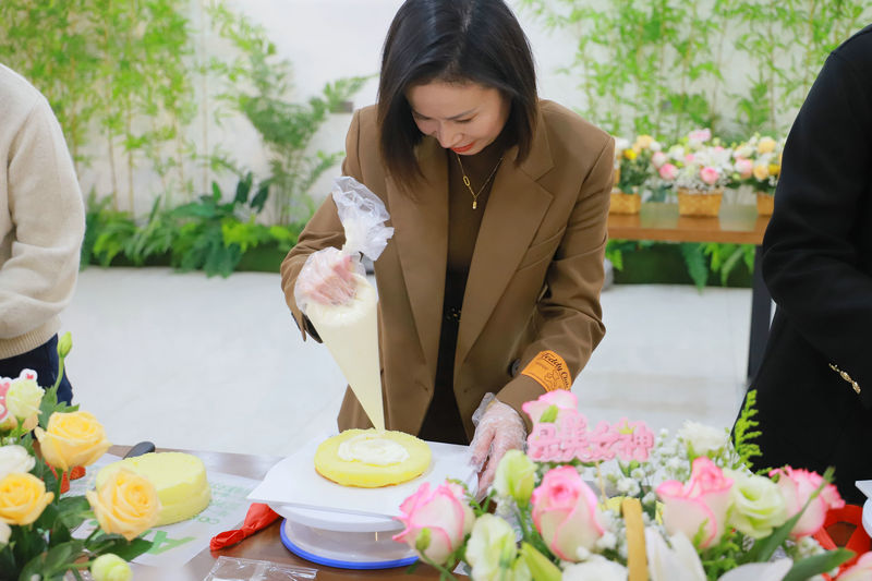 隨后,在專業(yè)烘焙老師的帶領下,大家?guī)狭耸痔?,聚精會神地觀看老師的講解、制作和演示。從蛋糕胚的組合擺放,奶油的抹面,再到最后的造型裝飾,大家興致勃勃地動起手化身美麗“廚娘”,現(xiàn)學現(xiàn)做,一雙雙靈巧的手制作出一個個獨具匠心的蛋糕,歡聲笑語和著蛋糕的香甜彌漫在整個制作室。