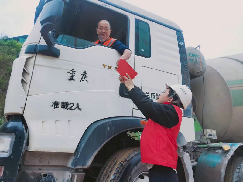 項目部學雷鋒志愿者為進入隧道罐車司機發(fā)放安全、質量、環(huán)保宣傳傳單