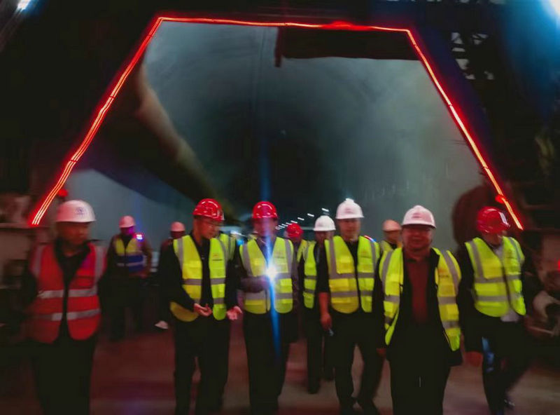 劉偉(右4)查看中梁山隧道進(jìn)口施工現(xiàn)場(chǎng)