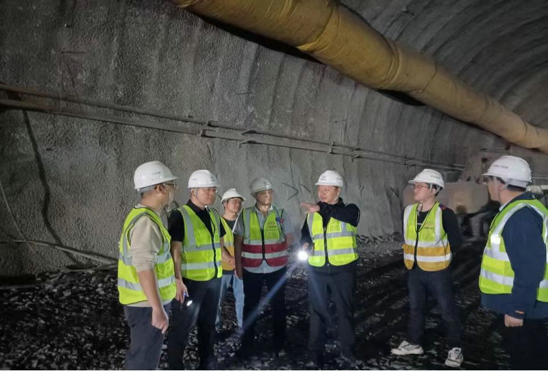 公司副總經(jīng)理兼總工程師李洪江(右3)工會副主席張泉濱(右1)在中梁山隧道進口進行技術(shù)指導(dǎo)