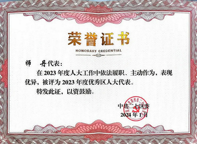 近日,中鐵中產(chǎn)置業(yè)公司總經(jīng)理師丹獲得二七區(qū)“2023年度優(yōu)秀區(qū)人大代表”榮譽(yù),為樹立企業(yè)外部形象、推動(dòng)中鐵中產(chǎn)置業(yè)公司高質(zhì)量發(fā)展做出了積極的貢獻(xiàn)。