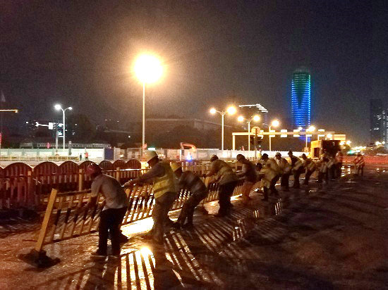 為了鼓舞士氣,譚書記親自去找便利店為大家買了紅牛等飲料,一來讓大家解解渴,二來也是讓大家喘口氣,歇會再干。“這么多天,我們起早貪黑的為了什么?不就是為了今天的導(dǎo)改么?我知道大家都很累,我也累,眼看就透亮了,大家再加把勁兒啊!”王總盤著腿坐在地上,一邊和大家一樣喝飲料補充著體能,一邊利用這個時間作著動員。不一會兒,大家收拾好空瓶子又干了起來。凌晨3點左右,現(xiàn)場西北角的護欄率先全部擺放完畢。空閑下來的人帶來了繩子和叉車趕緊往東北角和西南角集合;凌晨4點,所有護欄、水碼按計劃歸位,導(dǎo)改順利完成。
