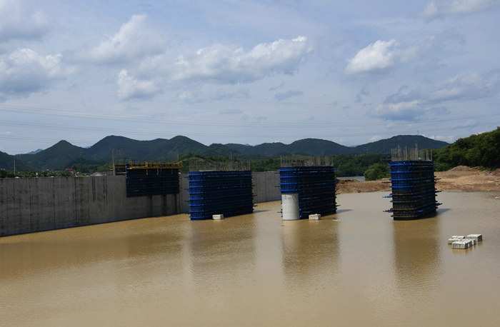 汛期過后,根據(jù)總體設計方案,再筑圍堰,除完工的混凝土導流墻可做一部分圍堰外,在倒流墻兩側(cè)再填筑部分堤壩,屆時將恢復4個泄洪閘墩上部結(jié)構(gòu)施工。