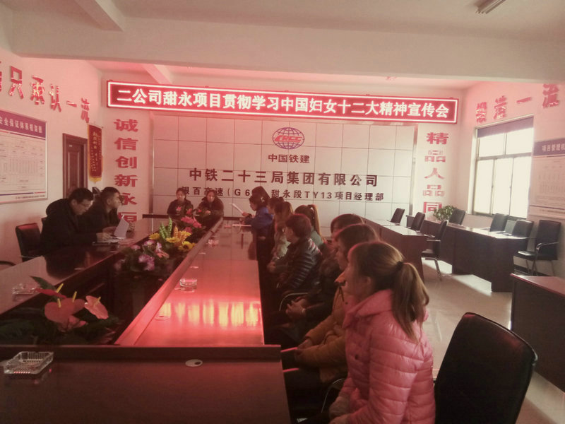 12月21日,中鐵二十三局二公司甜永TY13標(biāo)項(xiàng)目部舉辦了貫徹學(xué)習(xí)中國婦女十二大會精神宣傳會,會議由項(xiàng)目部12位女職工參加, 特邀請了項(xiàng)目經(jīng)理康勇、項(xiàng)目副經(jīng)理唐書恒參加了會議。
