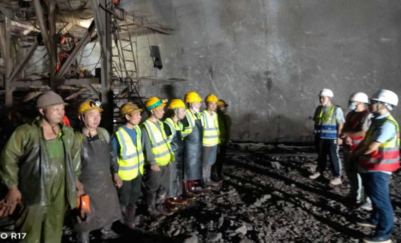 16標(biāo)項(xiàng)目部中梁山隧道掘進(jìn)工班在洞內(nèi)進(jìn)行班前安全教育動(dòng)員,鼓舞士氣,增強(qiáng)戰(zhàn)勝困難信心。(杜曉言攝