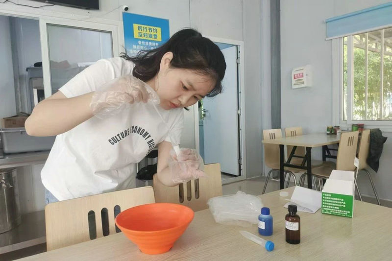 夏秋季節(jié)天氣炎熱,蚊蠅繁殖快,給職工健康帶來一定危害。為保證食堂餐具、職工碗筷干凈衛(wèi)生,項(xiàng)目綜合辦公室人員根據(jù)主管領(lǐng)導(dǎo)安排,按照餐飲衛(wèi)生標(biāo)準(zhǔn),選用一款既經(jīng)濟(jì)又高效快捷的檢測試劑對餐具、碗筷進(jìn)行衛(wèi)生檢測,該試劑能在3-5分鐘內(nèi)快速檢測出餐具表面清潔是否合格,陰離子合成洗滌劑的殘留量是否超標(biāo)。同時,將所有餐具進(jìn)行集中殺菌消毒,讓職工放心地就餐。