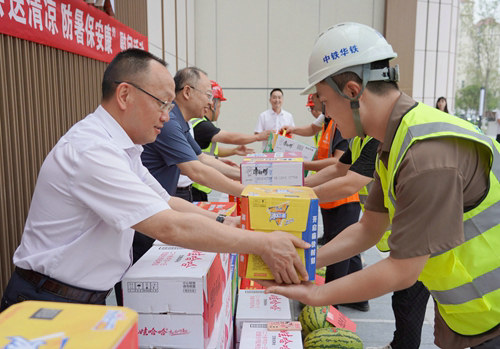 在慰問(wèn)現(xiàn)場(chǎng),舒軍華一行為施工現(xiàn)場(chǎng)管理人員、勞務(wù)工代表等共計(jì)50余人,送上了礦泉水、方便面、西瓜、降暑飲品等慰問(wèn)品,并代表中鐵城投對(duì)建設(shè)者們致以崇高的敬意和親切的慰問(wèn)。