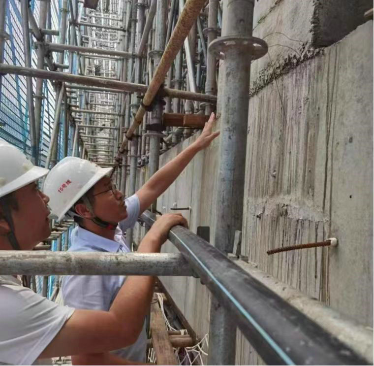 總承包部副指揮長(zhǎng)兼總工程師楊振(右1)在現(xiàn)場(chǎng)檢查