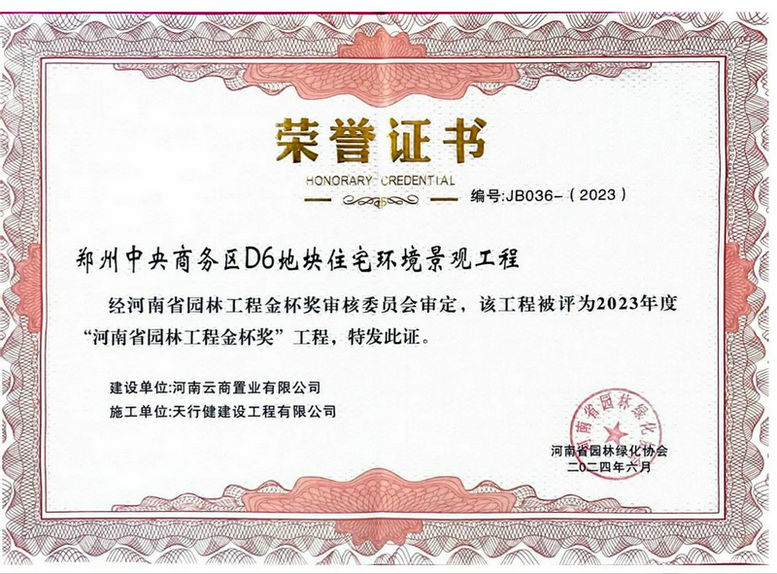 近日,經(jīng)河南省園林綠化協(xié)會(huì)委員會(huì)審定,中鐵中產(chǎn)置業(yè)公司鄭州中央商務(wù)區(qū)項(xiàng)目D6地塊住宅環(huán)境景觀工程榮獲“2023年度河南省園林工程金杯獎(jiǎng)”榮譽(yù)。