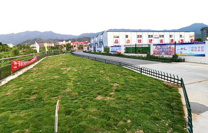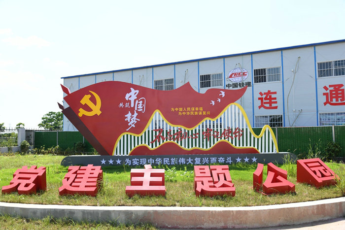 樣板先行不僅在項(xiàng)目部駐地落地,也在去年9月份最早開工的招賢樞紐強(qiáng)勢鋪開。首先將一座大型拌合中心、鋼筋加工大棚和中心試驗(yàn)室的大面積場地進(jìn)行硬化,并將試驗(yàn)室和宿舍用花草進(jìn)行裝點(diǎn),還將拌合中心一角約半畝多的空地種上地毯般的綠草,周邊是一圈植物,將黨建內(nèi)容以圖文并茂的形式印制在工藝品般的宣傳牌上豎立一側(cè),中間是一面大型塑膠紅旗,前面是“黨建主題公園”6個大字,使這個綠地小公園成為招賢拌合中心一大亮點(diǎn)。同時,該項(xiàng)目部將招賢樞紐進(jìn)口通往320國道的一條300多米長的舊路拓寬改造,鋪上瀝青,兩側(cè)裝上綠色鐵藝護(hù)欄,護(hù)欄外側(cè)空地是花草,并在道路一側(cè)兩米多高的拌合中心護(hù)欄上懸掛印有中國鐵建文化內(nèi)容的展示牌,以較強(qiáng)的視覺效果吸引了許多企業(yè)內(nèi)外人士駐足觀看。