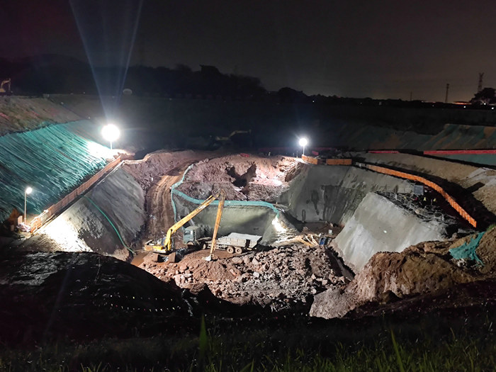 在施工中,該項(xiàng)目于今年4月份采取分層填筑、碾壓、鋪設(shè)土工布、鄰水面砌筑片石加固等辦法建設(shè)圍堰,利用區(qū)域內(nèi)40000多立方沙土和10000多立方片石建成一座高圍堰,經(jīng)受住了今年4次特大洪水的考驗(yàn)。基坑開挖觸底深度垂直30多米,挖掘機(jī)、破碎機(jī)炮擊由淺入深,越后面難度越大。地下水豐富,該項(xiàng)目部在兩側(cè)半腰建了一個(gè)流水槽攔截大涌水,將其匯聚到水井再外排,底部的涌水則由大型抽水機(jī)階梯式24小時(shí)接力外抽,保持工作面相對(duì)干燥。基坑越往下挖,塌方的幾率越高,項(xiàng)目部采取掛網(wǎng)噴錨的辦法遏制住了塌方。隨著開挖的深入,自卸車倒運(yùn)棄渣的難度漸漸增大,為解決這個(gè)問(wèn)題,從出口延伸到底部一左一右兩條彎道很大的便道,一車車棄渣順利運(yùn)至棄渣場(chǎng)。