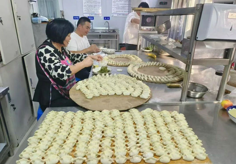 隨后,大家一起動手包餃子。面粉是今年豐收的小麥研磨而成,餃子餡兒里的韭菜是新割的秋韭。大家分工協(xié)作、井然有序,一邊包餃子,一邊話家常,在歡笑中相互切磋著包餃子的技巧,食堂里歡歡喜喜、熱熱鬧鬧。
