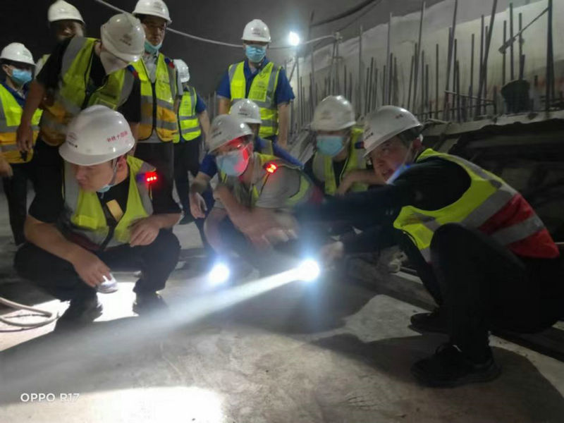 項(xiàng)目書(shū)記韓崇生(左1)組織黨員干部融合施工生產(chǎn)堅(jiān)持帶班“夜查”