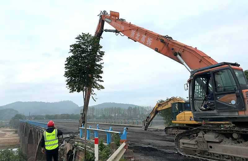 為安全拆除富足山大橋,該項(xiàng)目團(tuán)隊(duì)制定科學(xué)的拆除方案,并取得業(yè)主、駐地交警部門的大力支持。同時(shí),他們選用經(jīng)驗(yàn)豐富的拆橋隊(duì)進(jìn)駐現(xiàn)場,在一側(cè)搭設(shè)一座棧橋,便于挖掘機(jī)、吊車等大型機(jī)械設(shè)備作業(yè),并采取先拆除自來水管道、光纜、電纜、網(wǎng)線等多條管線以及防護(hù)欄、橋面,后進(jìn)行炮擊的方法,“智取”依附于大石拱上方的46個(gè)小石拱,再攻克承重大石拱,從兩頭向中間合圍。在安全保障方面,他們除在大橋兩端設(shè)立警示牌,安排員工參加由交警授課的培訓(xùn)班,掌握指揮車輛和行人的規(guī)范動(dòng)作外,另組織員工手拿小旗、身穿反光背心,輪流在大橋兩端路口指揮交通,以防有人“沖卡”進(jìn)入。此外,他們對拆橋作業(yè)人員集中進(jìn)行崗前安全教育培訓(xùn),并安排專職安全員對拆除全過程進(jìn)行重點(diǎn)盯控。