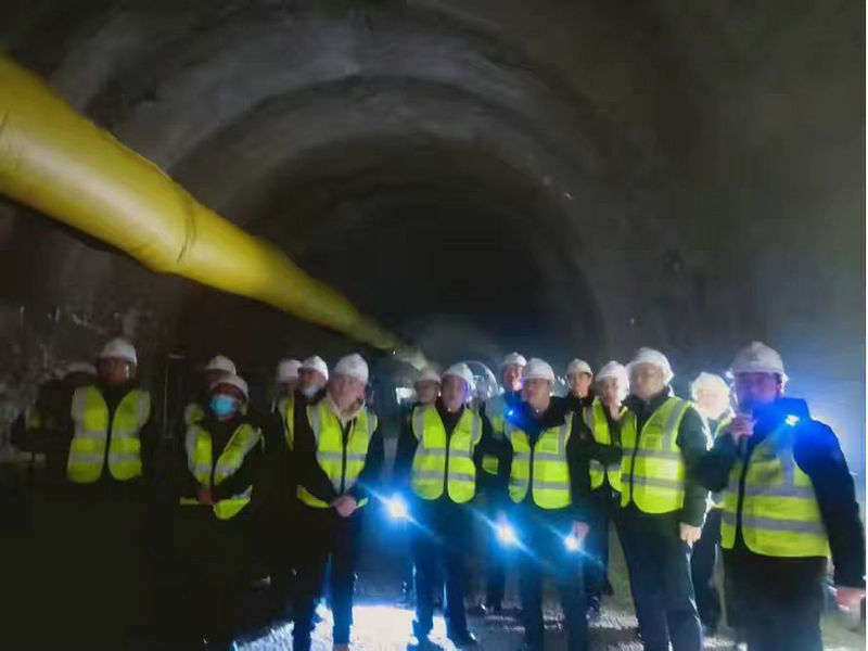 項(xiàng)目經(jīng)理阮超(右一)在中梁山隧道進(jìn)口掌子面向新疆有關(guān)建設(shè)單位百人觀摩團(tuán)講解礦山法隧道施工。截止目前,該項(xiàng)目已接待有關(guān)參觀團(tuán)60多起近2000人次。