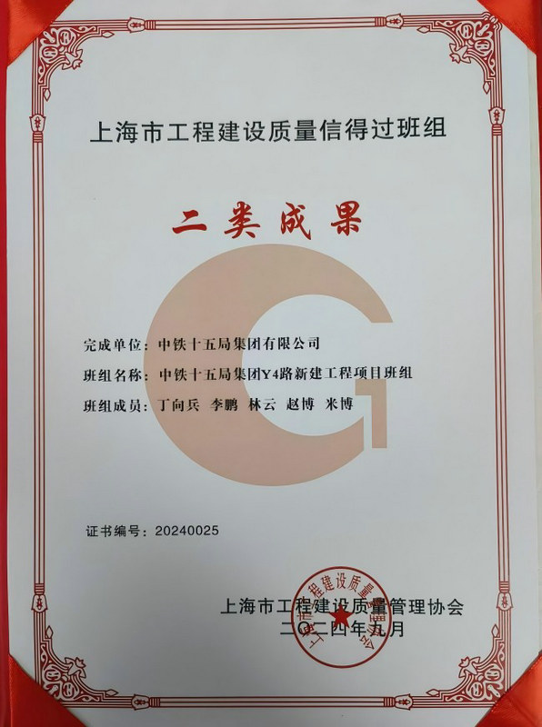 鐵路工程建設(shè)網(wǎng)訊(通訊員 張聰聰)近日,中鐵十五局二公司Y4路項(xiàng)目憑借在工程質(zhì)量管理上的顯著成績,榮獲上海市工程建設(shè)質(zhì)量管理協(xié)會(huì)發(fā)布的上海市工程建設(shè)質(zhì)量信得過班組二類成果獎(jiǎng)。