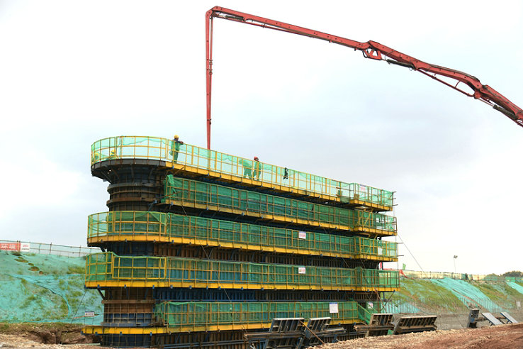 中鐵十五局承建的常山江航電樞紐項目主要工程有:拆除1座水電站,新建4座樞紐、1座跨江人行天橋,改建3座大橋,總投資35.8億元,2019年8月完工,工期6年。閣底樞紐是繼招賢、白虎灘之后,于7月15日開工的第3座樞紐,由發(fā)電站、導流墻、泄洪閘、應急過船設(shè)施、船閘、廠房、錨地、航道疏浚、護岸等組成。在河道設(shè)15孔×15米泄洪閘,閘門高6.5米,閘室底層為基巖,泄洪閘總寬282.6米,閘墩15個,每個閘墩長、寬、高分別為19米、2.6米、14.5米(含底板),混凝土553立方。按照計劃,在12月底前的5個半月完成導流墻和9個閘墩鋼筋混凝土施工,時間緊、工程量大,管理團隊全力以赴為進度、安全質(zhì)量、環(huán)保節(jié)點目標而群策群力,優(yōu)化施工組織方案,使每一道工序在各自為陣中不斷換檔提速,施工進度突飛猛進。在泄洪閘基坑開挖時,遭遇破碎巖石,挖掘機挖不動,該項目部采取多臺挖掘機操縱炮頭聯(lián)合作戰(zhàn)的辦法,一立方一立方地攻克,由難變易,達到基礎(chǔ)標高,馬上澆注10厘米厚的墊層,再布設(shè)鋼筋網(wǎng),澆注3米厚的混凝土底板,為泄洪閘墩首節(jié)和上部結(jié)構(gòu)施工創(chuàng)造條件。在底板施工時,利用長臂挖掘機和自卸車運料的便捷優(yōu)勢完成混凝土澆注任務(wù),省時省力,與罐車運輸、泵車灌注相比節(jié)省不少成本。