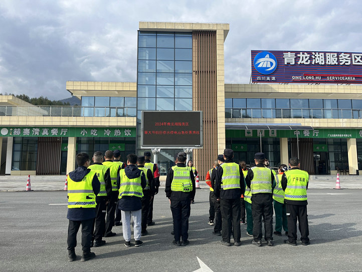 演練以青川地區(qū)突發(fā)地震導(dǎo)致停水停電、旅客滯留服務(wù)區(qū)為背景。區(qū)管人員判明情況后一邊立即上報運營中心,一邊通過手持式喊話器對滯留旅客說明情況、進行安撫。機電維護組立即排查故障原因,啟動備用電源應(yīng)急,組織搶修工作。道路養(yǎng)護組緊急調(diào)配儲水設(shè)備,保證旅客飲水、如廁需求。道路巡查組聯(lián)合高速公安、高速執(zhí)法單位迅速奔赴服務(wù)區(qū)維護現(xiàn)場秩序,配合服務(wù)區(qū)工作人員安撫旅客、人工引導(dǎo)車輛有序停放和通行。監(jiān)控中心及時反饋現(xiàn)場情況,對各類應(yīng)急處置力量進行調(diào)度。