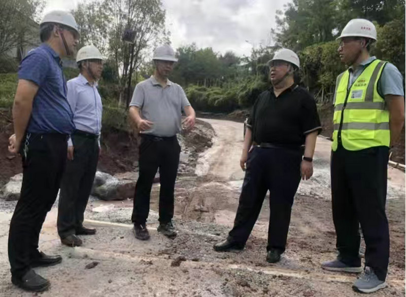 總承包部黨工委書記王向平(右1)、指揮長李兵(右2)、副指揮長陳華富(左3)、李燕斌(左2)在施工現(xiàn)場調(diào)研