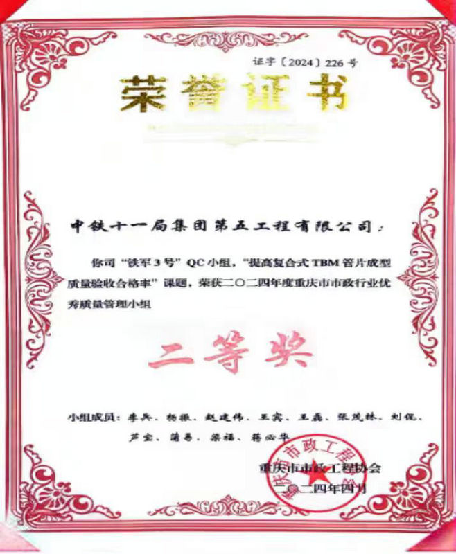 “一股勁”闖難關(guān),體現(xiàn)了項目部領(lǐng)導(dǎo)班子面對困難時的無畏勇氣和堅韌不拔的毅力。軌道交通建設(shè)從來不是一帆風(fēng)順的,15號線18標(biāo)項目也不例外。在施工過程中,復(fù)雜的地質(zhì)條件是第一道難關(guān)。重慶的山地地形使得地下巖層結(jié)構(gòu)多變,有的地方巖石堅硬如鐵,盾構(gòu)機在掘進(jìn)過程中面臨巨大的阻力,刀具磨損嚴(yán)重;而有的地方又土質(zhì)松軟,容易出現(xiàn)塌方的危險。面對這些難題,領(lǐng)導(dǎo)班子沒有絲毫退縮。他們帶領(lǐng)著技術(shù)團隊深入研究地質(zhì)資料,多次邀請國內(nèi)知名的地質(zhì)專家前來會診。為了解決盾構(gòu)機刀具磨損問題,他們與設(shè)備制造商密切溝通,嘗試改進(jìn)刀具的材質(zhì)和設(shè)計。同時,加強對施工現(xiàn)場的監(jiān)測,一旦發(fā)現(xiàn)土質(zhì)松軟的地段,迅速調(diào)整施工工藝,增加支護(hù)結(jié)構(gòu),確保施工安全。除了地質(zhì)問題,管片拼裝質(zhì)量達(dá)到無破損、無滲漏、無錯臺標(biāo)準(zhǔn)也是一個關(guān)鍵問題,為達(dá)到“三無”標(biāo)準(zhǔn)要求,提高質(zhì)量和工效,領(lǐng)導(dǎo)班子鼓勵技術(shù)人員勇于創(chuàng)新,改進(jìn)管片拼裝工藝,提高了TBM管片成型質(zhì)量驗收合格率,該項成果榮獲重慶市市政工程協(xié)會2024年度重慶市市政行業(yè)優(yōu)秀質(zhì)量小組二等獎、重慶市建筑業(yè)協(xié)會2023年度工程建設(shè)優(yōu)秀質(zhì)量管理小組競賽活動II類成果獎。