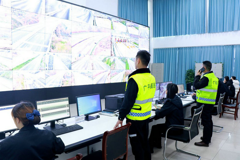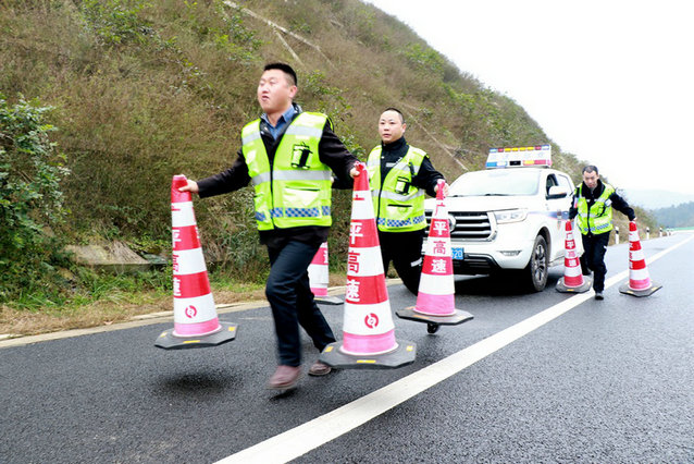 接到報警電話后,廣平高速監(jiān)控中心立即調(diào)出事故現(xiàn)場畫面,經(jīng)初步研判后啟動應急處置預案;“一路三方”值班領(lǐng)導迅速到達監(jiān)控中心聯(lián)合指揮,封控、救援、清障等應急力量緊急向事故現(xiàn)場開進。封控小組先行一步,臨時封閉高速入口,在事故現(xiàn)場后方設置警示標志,為后續(xù)行動留下安全空間;救援小組按照“先人、再車、后設施”順序,檢查人員傷亡和車輛、路面設施受損情況,做好現(xiàn)場應急處理和后送醫(yī)院準備;清障小組到達后,拖走事故車輛,人工與機械結(jié)合清理路面積雪結(jié)冰、布撒融雪劑,維修護欄。
