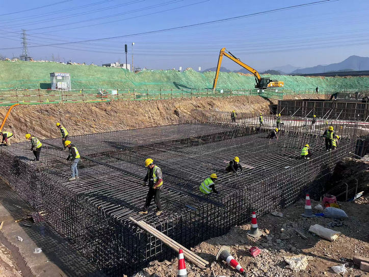 在筑堤壩的同時,開挖導(dǎo)流墻、泄洪閘基坑,4臺破碎錘炮擊,挖掘機(jī)將松動的渣土裝進(jìn)大型自卸車,浩浩蕩蕩的車隊將一方方渣土運(yùn)至堤壩或者棄渣場,循環(huán)往復(fù),將最難攻克的河床基礎(chǔ)掘地6米多深,坑道逐漸成型,然后澆縱橫向?qū)Я鲏ΑM向泄洪閘首層混凝土。在首層混凝土打底完成之后,率先進(jìn)入鋼筋混凝土施工的導(dǎo)流墻,分段作業(yè),從A—H共8段,將布好鋼筋網(wǎng)的底板澆注結(jié)束,待混凝土完全達(dá)到強(qiáng)度,就進(jìn)入導(dǎo)流墻首節(jié)和上部施工,澆注混凝土一氣呵成,完成一段,拆模后又進(jìn)入另一段綁扎鋼筋網(wǎng)、安裝模具、灌注混凝土程序。