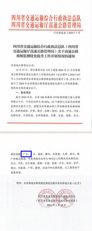 廣元訊(通訊員 馬軼鋒)1月10日,四川省交通運輸綜合行政執(zhí)法總隊、四川省交通運輸廳高速公路管理局聯(lián)合下發(fā)《關(guān)于高速公路視頻監(jiān)測優(yōu)化提升工作開展情況的通知》,由北新路橋集團承建、運營的廣平高速是受到表彰的高速公路之一。