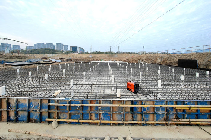 在泄洪閘底板、消力池基礎(chǔ)施工中,該項目動用多臺破碎錘炮擊、挖掘機與渣土車裝運,堅硬的碎巖、泥巖,從掘進深度1米到10多米,一點點攻克,并向縱橫拓展,符合澆注第一層混凝土條件時,分倉完成底板、消力池首層“打底”,然后布設(shè)縱橫交錯的鋼筋網(wǎng)、從首倉到末倉依次澆注混凝土。他們采取底板與消力池同步施工,利用長臂挖掘機灌注或罐車與泵車配合作業(yè)的辦法,待上一倉混凝土強度達標,進入下一倉安裝模具、布網(wǎng)、澆注程序,依次推進,確保了施工進度。