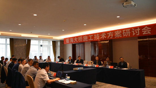 圖一、中國(guó)鐵建大橋局總工宋偉俊一行聽(tīng)取廣州番海大橋項(xiàng)目施工技術(shù)方案匯報(bào)