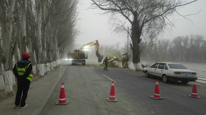晚21時(shí),救援隊(duì)抵達(dá)險(xiǎn)情地點(diǎn)。現(xiàn)場(chǎng)1棵直徑超40厘米的胡楊樹(shù)被連根拔起,橫亙309省道,上下行車(chē)輛被堵。中鐵二十一局搶險(xiǎn)分隊(duì)迅速設(shè)立安全警示標(biāo)志,封閉道路,組織機(jī)械、人力移除清理倒伏樹(shù)木,經(jīng)過(guò)1小時(shí)鏖戰(zhàn),排除殘枝路障險(xiǎn)情,恢復(fù)309省道交通。搶險(xiǎn)分隊(duì)沿309省持續(xù)排查隱患,清理殘枝樹(shù)木,確保省道暢通,受到屬地交通管理部門(mén)及駐地群眾的贊譽(yù)。