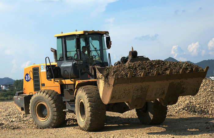 鏟車(chē)往電站圍堰運(yùn)輸泥沙石 郝偉亮攝