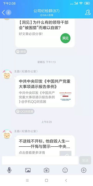 兼職人員誦好“三日經”。為加強所屬各單位專兼職紀檢監(jiān)察人員的教育和培訓,利用qq群和微信群發(fā)送學習內容、上傳廉政規(guī)定、提出廉潔要求、上好廉政黨課、加強廉潔教育。每三日發(fā)送一次,現(xiàn)已發(fā)送131期。各單位紀檢監(jiān)察員在誦好“三日經”的同時,還將內容及時轉發(fā)到本單位qq群和微信群中,讓全體黨員群眾認真學習有關規(guī)定和廉潔知識,做到了“手機在手,廉潔警示教育隨時有”。