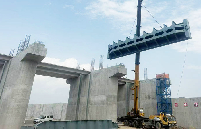 為了高效、安全、優(yōu)質(zhì)地完成泄洪閘閘門施工任務(wù),該項目部擇優(yōu)選用國內(nèi)一家閘門生產(chǎn)廠家定制一扇扇40多噸重的大閘門,并對運輸、起吊等全過程采取切實可行的安全防護(hù)措施,并選擇300噸的汽車吊進(jìn)行吊裝。經(jīng)過精心準(zhǔn)備,第一扇厚重的大鐵門安裝到位。
