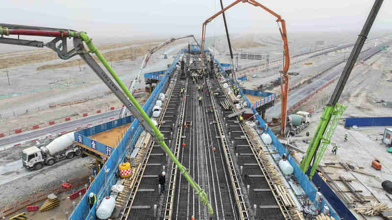 這座橫跨G315線的系桿拱橋全長319.27米,宛如一道長虹凌空飛架。其主梁采用等截面預應力混凝土箱梁結構,主跨徑達80米,每片梁體需澆筑965.9立方米混凝土。面對復雜的工程結構和較高的施工難度,項目團隊秉持精益求精的態(tài)度,采用混凝土一次性現(xiàn)場澆筑工藝,從源頭保障混凝土的均勻性與密實度,提升結構耐久性,為工程質量筑牢“鋼筋鐵骨”。