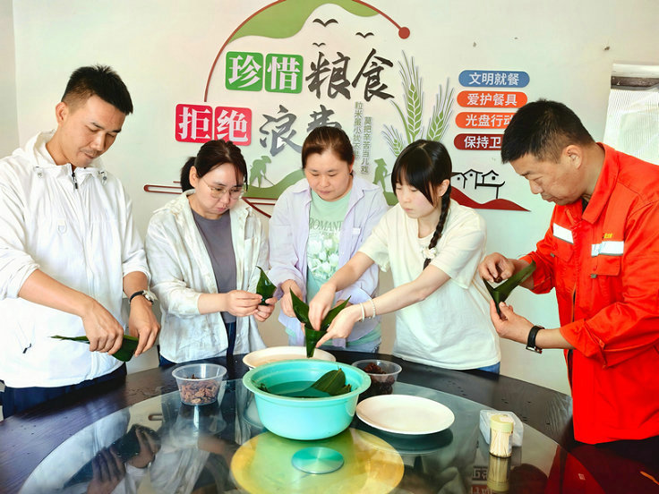 “大家快來參加活動(dòng),一起包粽子,今天的游戲環(huán)節(jié)豐富多彩,樂趣多多……”一片片清香的粽葉、一粒粒飽滿的糯米、一顆顆晶瑩剔透的蜜棗、一條條五彩的麻繩……在活動(dòng)開始前,包粽子的材料已整整齊齊擺放在活動(dòng)會(huì)場(chǎng)的桌子上,幾位經(jīng)驗(yàn)豐富的職工率先示范包粽子的技巧,從折疊粽葉、填充糯米到系繩固定,每一個(gè)步驟都講解得細(xì)致入微?,F(xiàn)場(chǎng)氣氛愈發(fā)濃烈大家當(dāng)即分成小組,一邊相互交流學(xué)習(xí),一邊動(dòng)手實(shí)踐。大家不僅掌握了基本技巧,還包出了一個(gè)個(gè)形狀各異、充滿創(chuàng)意的粽子,現(xiàn)場(chǎng)笑聲不斷,其樂融融,并將粽子煮熟一同分享勞動(dòng)成果。