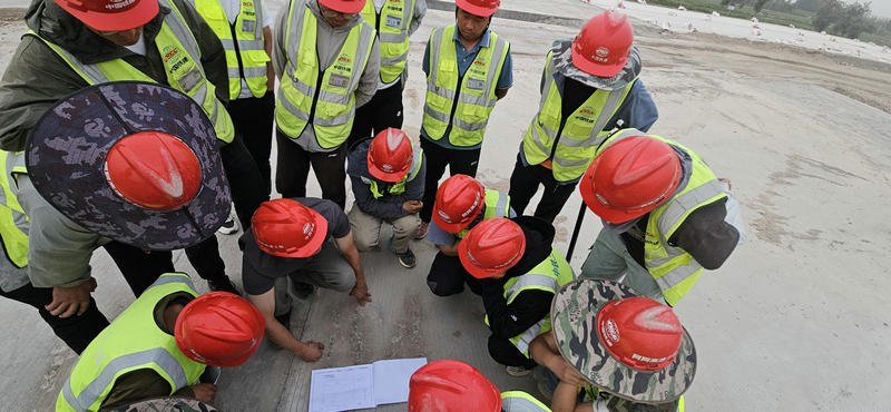 理論沉一線,破解技術(shù)堵點。項目將課堂搬到施工前沿,開展“圖紙+現(xiàn)場+問題”三位一體教學(xué)。在橋涵過渡段,技術(shù)負責(zé)人演示“壓實度分層測控法”,精準控制攤鋪與碾壓參數(shù),消除“橋頭跳車”隱患;路面作業(yè)區(qū)里,技術(shù)人員邊學(xué)水穩(wěn)層配比理論,邊實操攤鋪校準與碾壓調(diào)試,掌握“毫米級”精度;塔里木河特大橋現(xiàn)場,技術(shù)人員認真記錄要點,形成“學(xué)、看、解”閉環(huán)。