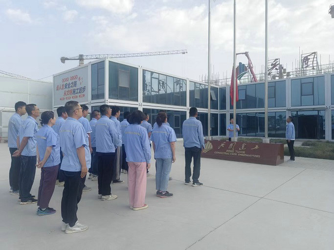 8時整,伴隨著激昂雄壯《義勇軍進行曲》奏響和鮮艷的五星紅旗冉冉升起。該公司全體管理人員身著統(tǒng)一工裝,整齊列隊,莊嚴肅立,向國旗行注目禮,齊聲高唱國歌,鏗鏘有力的歌聲回蕩在工地上空,熾熱的愛國愛黨之情在每個人心中澎湃涌動。
