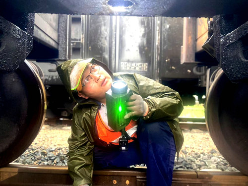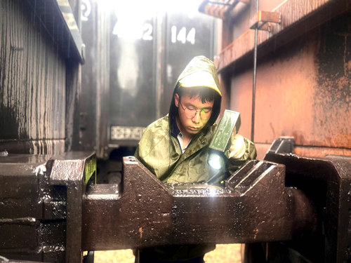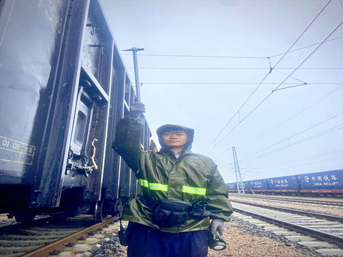 上午9時(shí)11分,伴隨著汽笛長(zhǎng)鳴,一列貨運(yùn)列車緩緩駛?cè)胫需F一局集團(tuán)新運(yùn)公司準(zhǔn)格爾鐵路公司管內(nèi)二道河站,早已等候在股道旁的列檢員們迅速投入工作。他們身穿熒光雨衣,手持檢車錘、手電筒,彎腰鉆入車底,仔細(xì)檢查車輛走行部、轉(zhuǎn)向架、車端連接部、制動(dòng)裝置等關(guān)鍵部位。