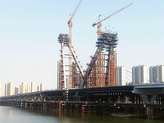 壽春西路橋工程全長1.033公里,橋梁總長845米,跨越淠河,是六安市東西主干道上的重要工程,也是六安市標志性地標建筑。主橋長178米,為“V”型塔雙索面斜塔斜拉橋,主梁為鋼砼混合梁結(jié)構(gòu),引橋為30米小箱梁結(jié)構(gòu)。截止目前,主橋副塔已實現(xiàn)混凝土合龍,主塔進行混凝土合龍段施工,全橋橋面已經(jīng)貫通。