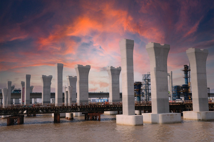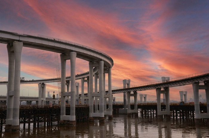 中鐵十五局承建的濱海高架、濱海樞紐互通位于寧波市鎮(zhèn)海區(qū)淺海水域,全長14.6公里,樁基1739根、承臺348座、橋墩812座。其中濱海樞紐互通全長9705米,是亞洲最大的海上樞紐互通。