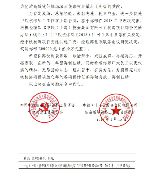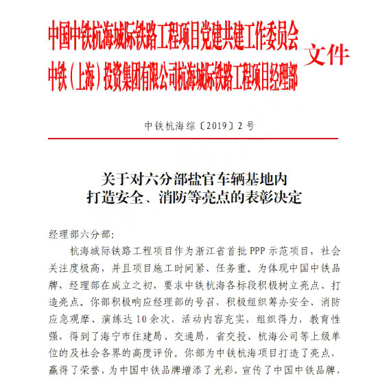 (海寧訊)4月19日,中鐵一局建安公司杭海城際項目部收到由中鐵(上海)投資集團(tuán)有限公司杭海城際項目部發(fā)來的表彰信。就中鐵一局建安公司承建的杭海城際項目部在安全、消防兩方面的良好表現(xiàn)予以表彰。 作為浙江省首批 PPP 示范項目,杭海城際鐵路工程項目社會關(guān)注度高、施工時間緊、任務(wù)重。項目部嚴(yán)格落實(shí)中鐵(上海)投資集團(tuán)有限公司杭海城際項目部提出的樹立和打造亮點(diǎn)要求,在安全、消防工作中狠下功夫,重視培訓(xùn)教育,嚴(yán)格現(xiàn)場監(jiān)督,先后組織籌辦安全、消防應(yīng)急觀摩、演練10余次,發(fā)揮了良好的教育和社會效應(yīng),得到了海寧市住建局、交通局,省交投以及杭海公司等社會各界的高度評價,為中國中鐵品牌增光添彩做出了積極貢獻(xiàn)。 下一步,項目部將繼續(xù)秉承“聚焦要點(diǎn),抓綱帶目”的工作要求,嚴(yán)守安全生產(chǎn)質(zhì)量關(guān),夯實(shí)廉政之基,完善標(biāo)準(zhǔn)化建設(shè),強(qiáng)化管理體系打好2019年收關(guān)之戰(zhàn)。