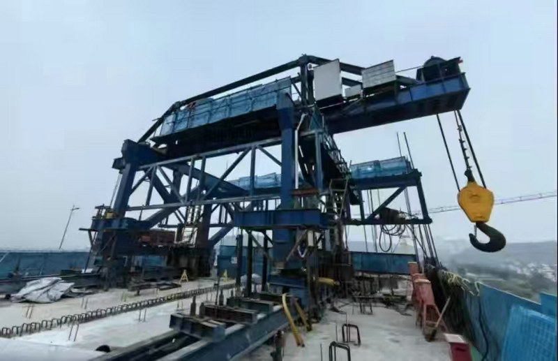 大橋采用鋼斜撐空腹連續(xù)剛構(gòu)的結(jié)構(gòu)形式,在國內(nèi)軌道交通橋梁建設(shè)中尚屬首例,鋼混混合式剛構(gòu)橋常規(guī)施工方法為先施工下弦鋼斜撐節(jié)段,后施工對應(yīng)的上弦混凝土節(jié)段,施工周期長,上下交叉作業(yè)安全風險高,且普通掛籃結(jié)合汽車起重機吊裝易受施工空間限制,經(jīng)濟性差。為研發(fā)“大橋掛吊一體裝置”關(guān)鍵技術(shù),總承包部副指揮長兼總工程師楊振在總承包部指揮長李兵、黨支部書記王向平等領(lǐng)導(dǎo)的重視支持下,他組織由中國鐵建重慶軌道交通15號線總承包部、中鐵建重慶投資集團、重慶交通大學、中鐵建大橋局集團三公司等單位聯(lián)合組成的科技研發(fā)團隊,圍繞“大橋掛吊一體裝置關(guān)鍵技術(shù)研究”課題立項研發(fā)。經(jīng)過團隊探索研究,掛吊一體裝置在掛籃主桁架上方設(shè)置一臺吊機形成吊裝系統(tǒng),吊裝系統(tǒng)包含天車及吊具系統(tǒng),可用于下弦鋼斜撐吊裝施工;通過對掛籃的改進,同時滿足上弦箱梁和下弦鋼斜撐施工。