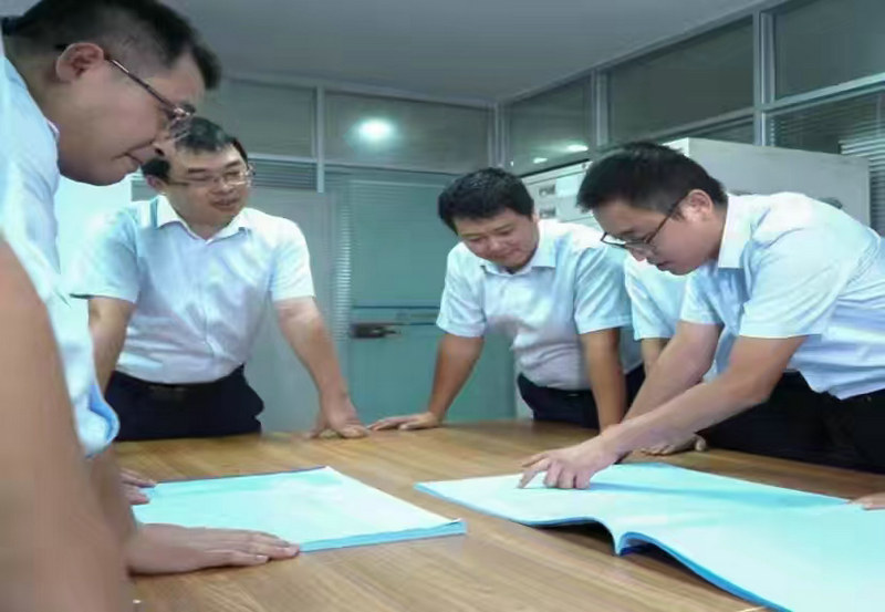 楊振(右1)與團隊成員在研究掛吊一體裝置方案